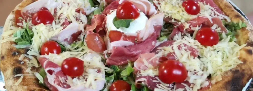 MARÀN ATHÀ: crema di pistacchio, porcini, mozzarella, speck, ciliegino, granella di pistacchio